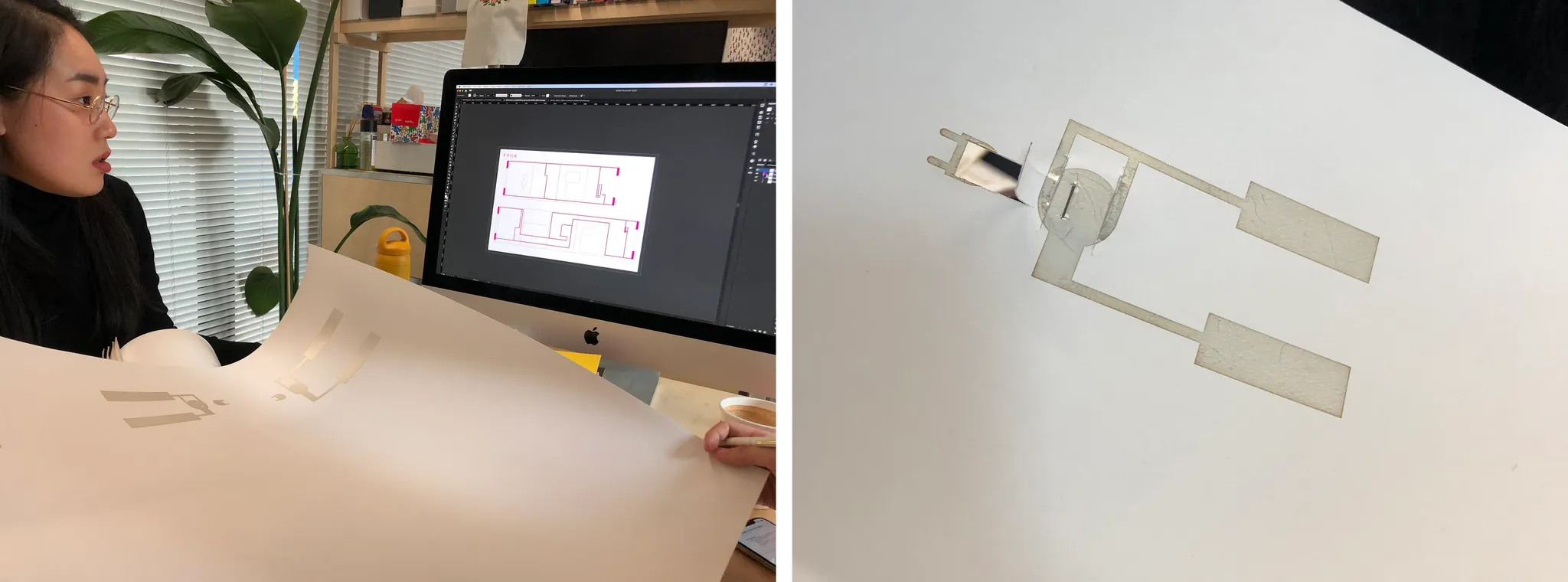 전선에서 구리 테이프, 전자 기판 실험 과정 전도성 잉크와 기판을 사용한 최종 모습. (사진 제공: 조민정 디자이너)