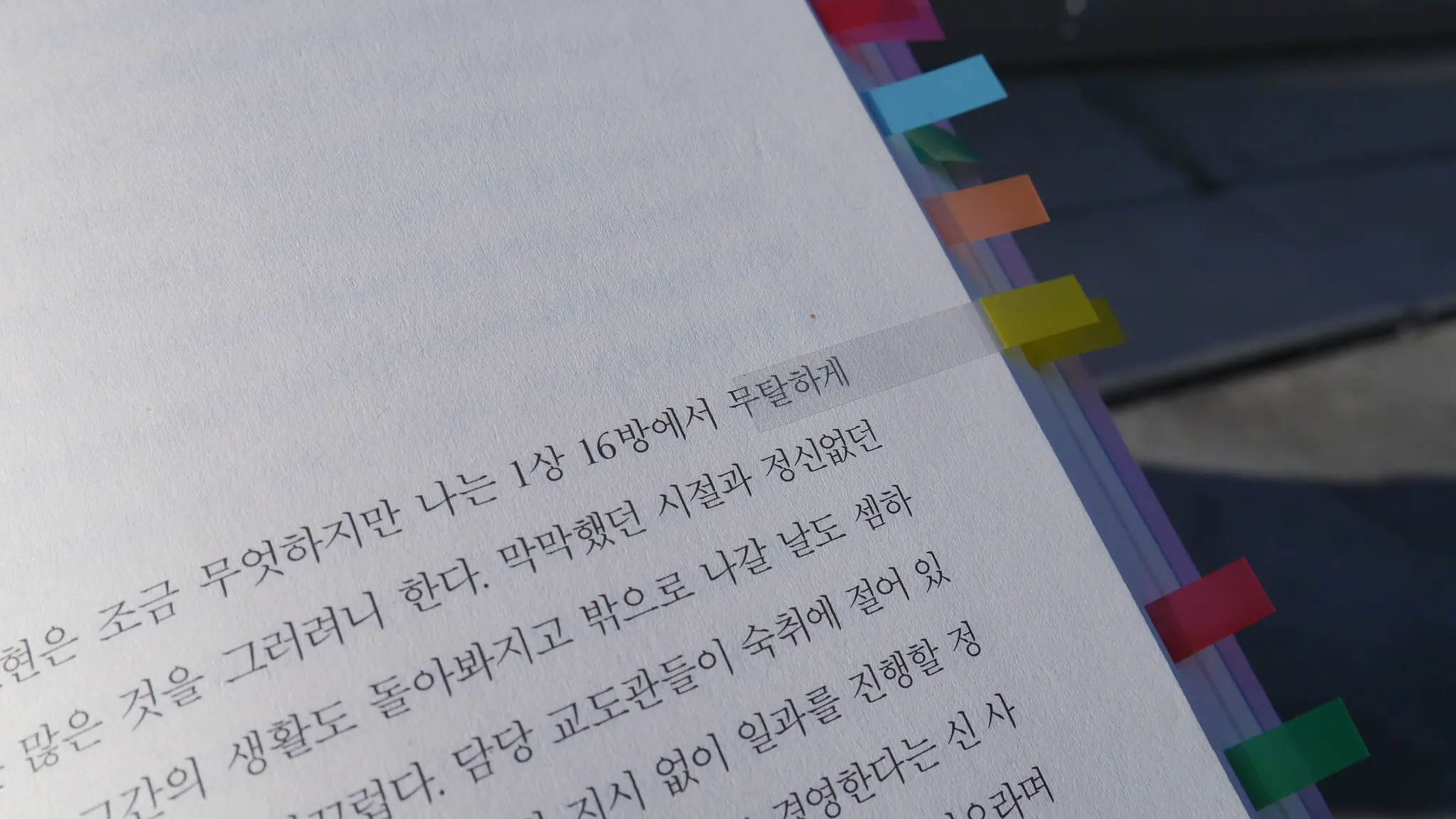 가장 처음 눈에 들어온 건 코팅하지 않은 종이였다. 출판 업계에서는 관리 상의 이유로 표지를 코팅하는 것이 기본처럼 여겨진다. 때가 타고 종이가 조금이라도 찢어지면 고스란히 출판사에 반품으로 돌아오기 때문이다. 아니면 비닐 래핑 공정을 추가해야 하는데 이때 발생하는 가격도 꽤 큰 부담이다. 해당 출판사에 문의해보니 표지 종이로 빌리지 200g/㎡ 백색을 사용했다고 한다. 빌리지는 카탈로그나 초청장 등 고급 인쇄물에 쓰이는 단가가 꽤 높은 종이다. 종이의 자연스러우면서도 독특한 결감이 벽돌을 연상시킨다. 책을 만질 때마다 감옥의 벽을 쓰다듬는 기분이 든다. 디자이너는 이를 의도하고 빌리지 용지를 선택한 걸까?