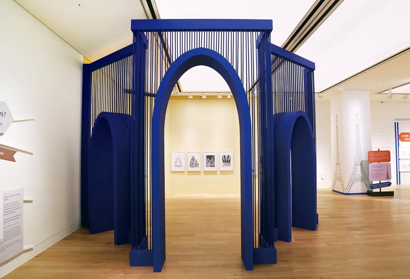 《말도 안돼! No Way!》전시 중, ‘아치’의 개념을 설명하기 위해 데이비드 맥컬레이 『고딕성당』의 가상 건축물, 쉬트로 대성당의 평·입면도를 참고하여 디자인한 스트링 아치 구조물.