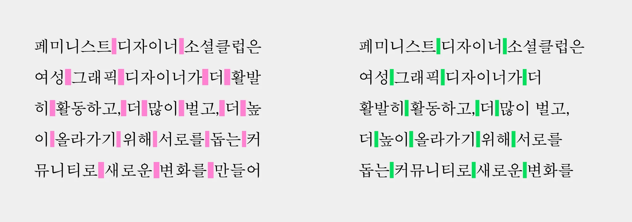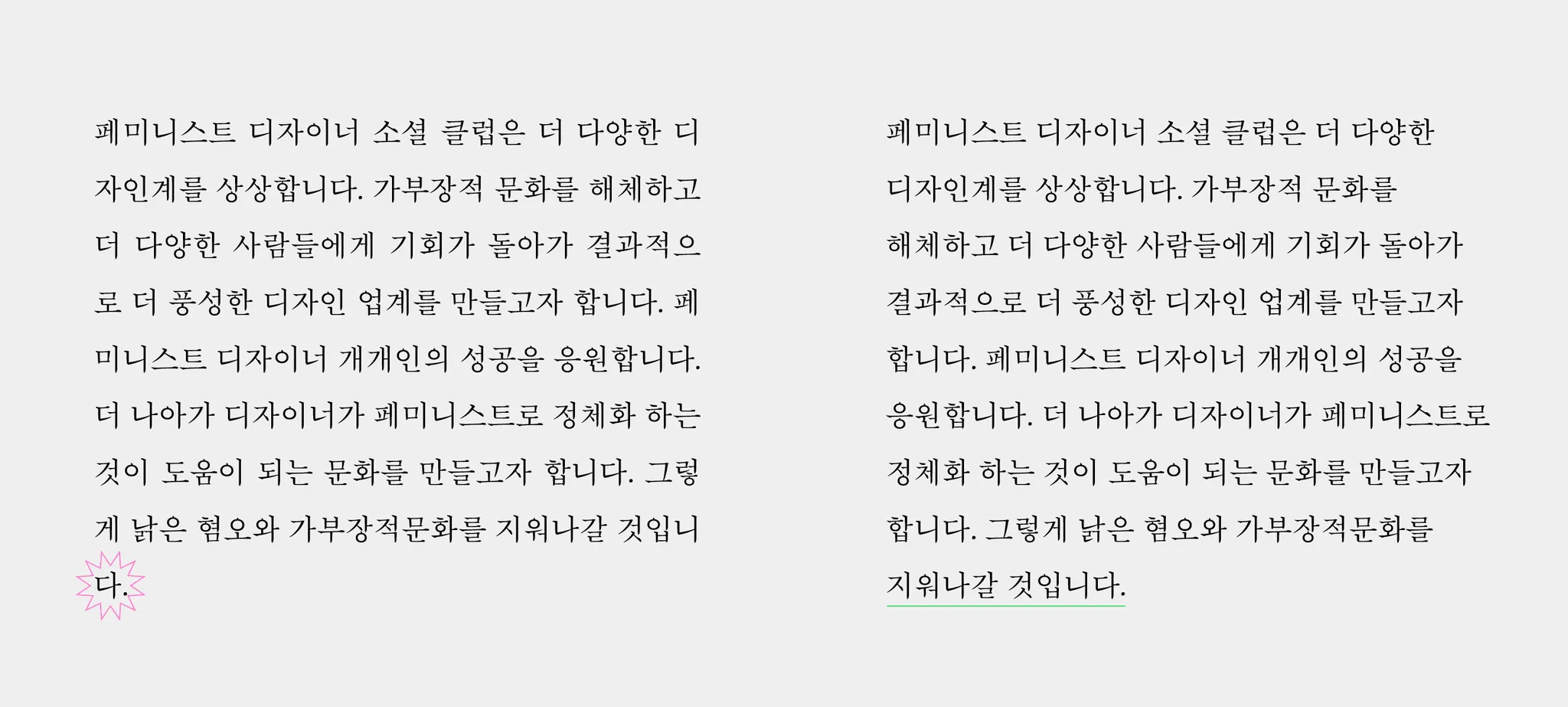 양끝맞춤을 하면 글자 간격과 단어 간격을 최대한 일정하게 유지하기 위해서 단어 중간에서 행이 갈리는 문장이 많습니다. 때문에 위 예시 글에서처럼 '서로를'이라는 단어는 '서'와 '로를'로, '한국에서'라는 단어는 '한국에'와 서'로 두 동강이 납니다. 이것들은 글을 읽고 쉽게 이해하는 데 방해 요소가 될 수 있습니다.