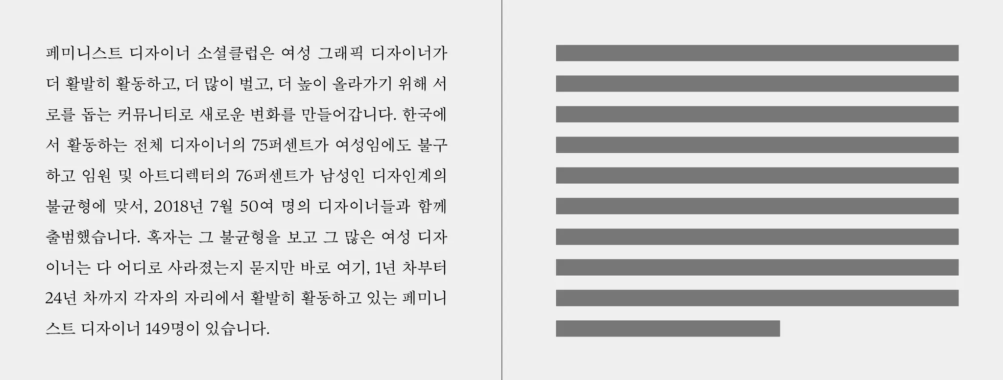 디자이너는 판형과 글 상자의 면적, 그리고 내용의 성격과 길이에 맞게 배열 방식을 계획합니다. 양끝맞춤을 적용할 때도, 왼끝맞춤(오른끝흘림)을 적용할 때도 있습니다. 그런데 양끝맞춤보다 왼끝맞춤을 했을 때 유난히 불만이 많이 들립니다. 양끝맞춤을 요구하는 이유를 물어보면 대부분 정확한 이유는 말해주지 않고 그냥 불편하다는 대답이 돌아옵니다. 저는 이 변론을 통해 디자이너가 왼끝맞춤을 선택하는 경우, 그 선택의 근거에 대해 호소하고자 하니 살펴봐 주시기 바랍니다.
