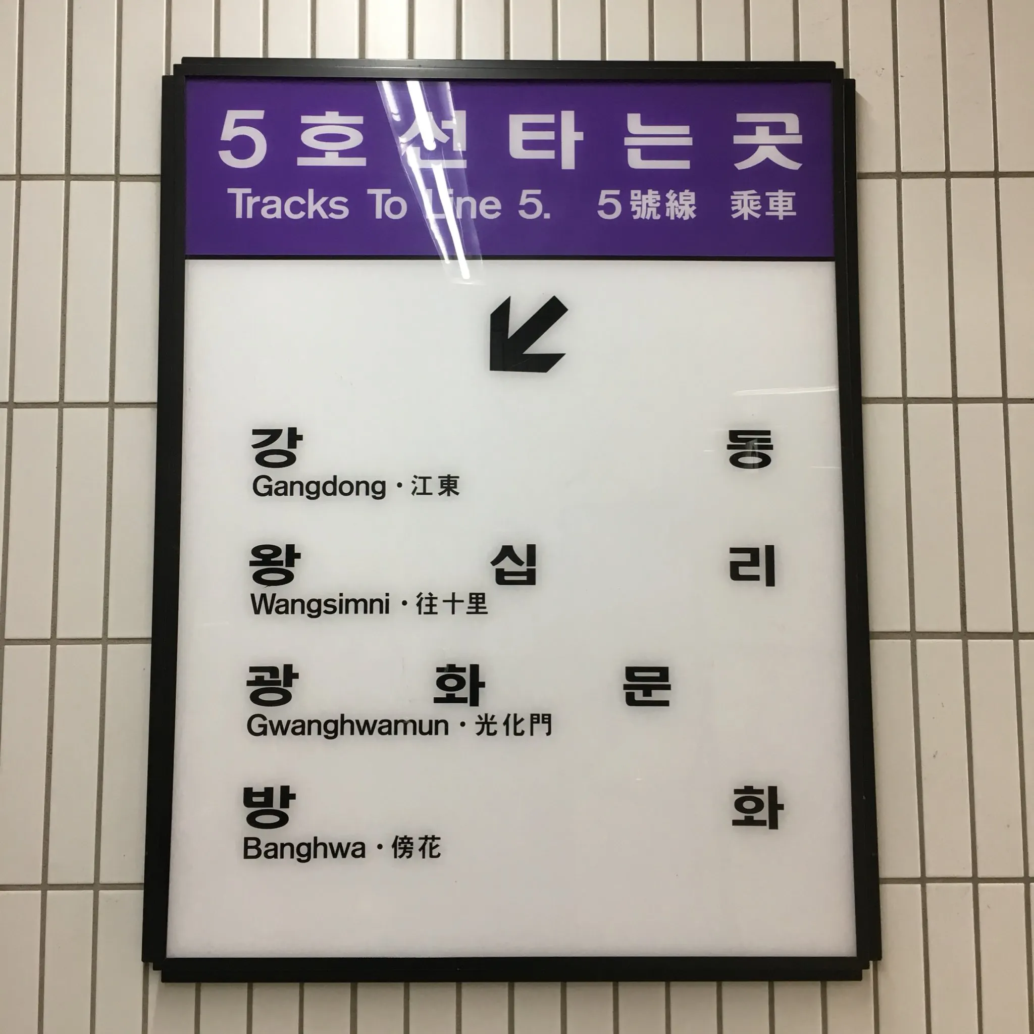 이 지하철 사인을 보십시오. ‘강동’의 ‘강’과 ‘동’이 각각 양 끝에 맞춰져 있습니다. ‘강동’이라고 읽기까지 시선을 많이 움직여야 하고 비교적 시간이 오래 걸립니다. 이렇게 글자 수에 비해 글줄이 길 경우에 양끝 정렬을 하면 글자들이 생이별하여 읽기 불편해지는 참혹한 사태가 일어날 수 있습니다.