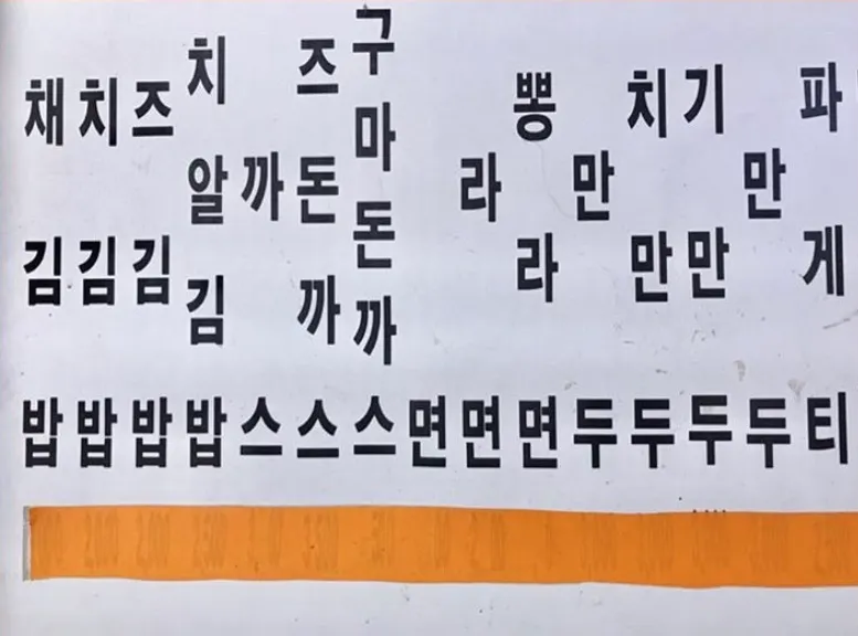 길거리에서 볼 수 있는 사인이나 메뉴판 등의 글자들은 세로쓰기 양끝맞춤으로 되어있는 경우가 많습니다. 이 증거 사진을 보십시오. 글줄당 글자 수가 적은 세로쓰기를 할 때 양끝을 맞출 경우에는 ‘채치즈’, ‘알까돈’, ‘뽕치기파’, ‘김김김’, ‘밥밥밥밥’으로 읽히게 되는 극단적으로 안타까운 사고가 발생하기도 합니다.