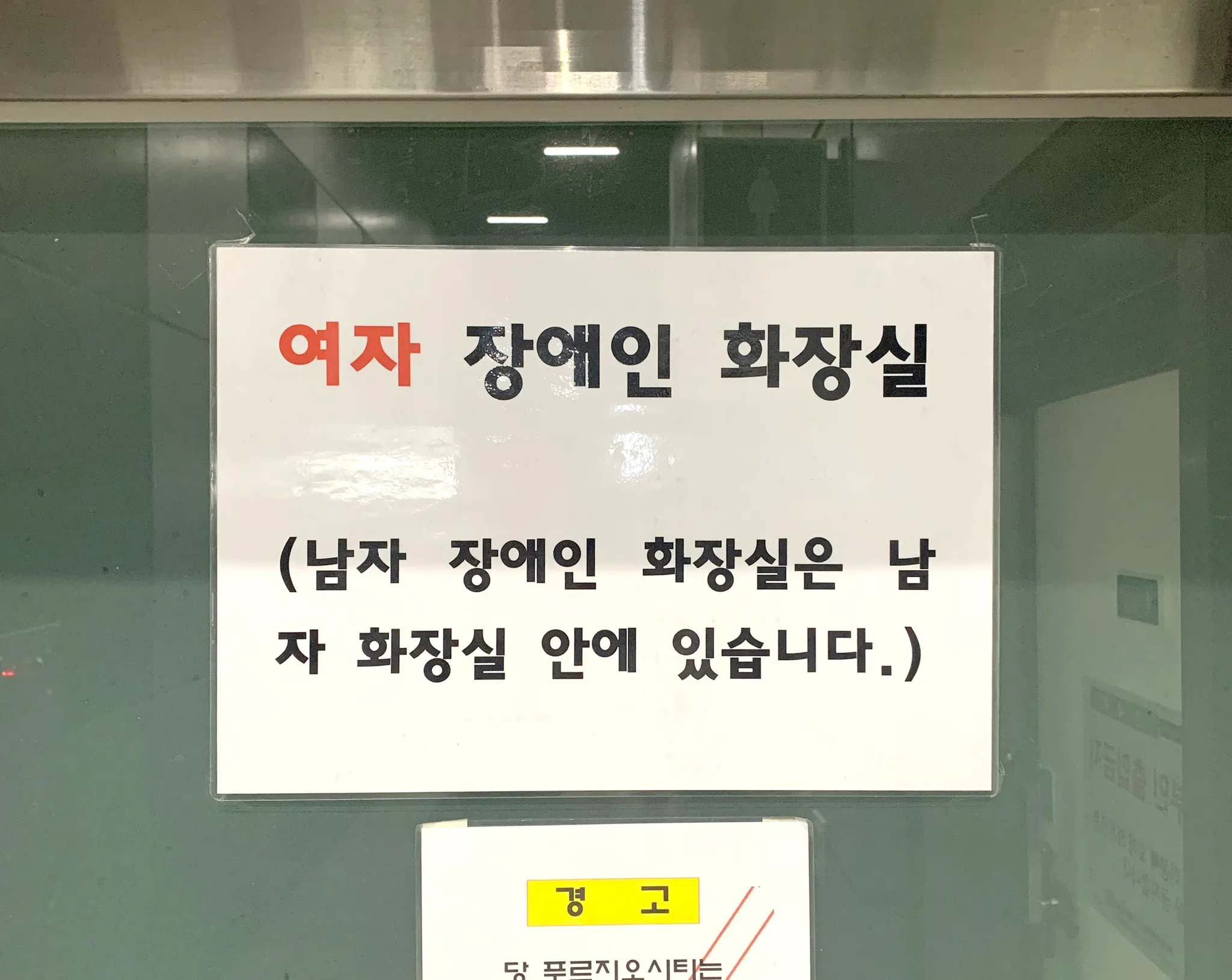 ‘남자 장애인 화장실은 남자 화장실 안에 있습니다.’라는 문장에서 ‘남’ 다음에 행갈이 되어 ‘자’가 다음 글줄에 들어가게 된 이 사례를 보십시오. 의미상 중요한 부분인 ‘남자’라는 단어의 중간이 끊겨 있어 불편함을 초래합니다. ‘남자 장애인 화장실은 / 남자 화장실 안에 있습니다.’라고 단어가 끊어지지 않고 행갈이 되었더라면 더 명료하게 인식될 것입니다.
