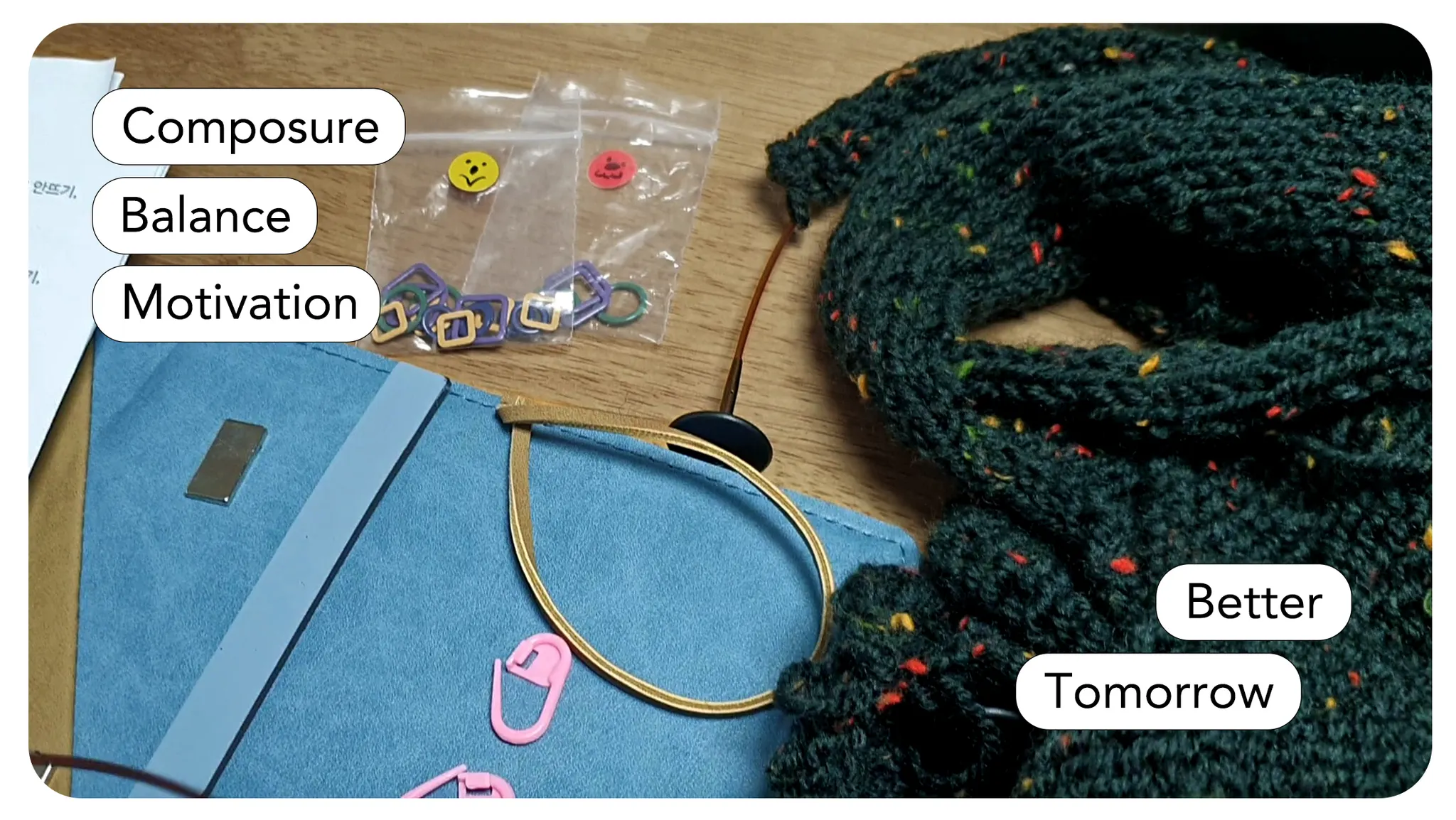 불안한 디자인의 시간에 반해 나에게 평안을 주는 존재가 있다. 뜨개를 하는 시간. 그 시간은 나에게 평안한 존재이다. 절대로 앞서거나 뒤서거나 하지않고 언제나 나와 함께 발맞추어 걸어가주는 친구. 울퉁불퉁 서툰 나의 모습까지도 정직하게 담아주어 오롯한 나를 마주할 수 있는 시간. 같은 시간이지만 내가 무엇을 하느냐에 따라 불안하기도 하고 평안을 느끼기도 한다.