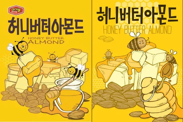 재미있는 점은 허니버터 아몬드가 본디 허니버터칩에 착안해 시작된 상품이지만, 지금은 허니버터 아몬드의 인기에 기대 이와 유사한 양념 아몬드 상품이 출시되고 있다는 사실이다. 지인의 어머니가 남대문 시장에서 길림양행의 허니버터 아몬드라고 생각하고 사 온 것이 머거본의 제품이었고, 집에 도착해서야 그림이 다르다(=잘못 사 왔다)는 것을 알아챘던 에피소드가 있었다. 실제로 2019년에는 머거본에서 출시한 허니버터 아몬드와의 확인대상표장에 대한 소극적 권리범위확인심판이 진행되기도 했다. 두 상품의 패키지가 주는 인상이 유사해 소비자가 두 상품을 오인하거나 혼동하는 상황을 초래할 수 있기 때문에 이런저런 상황 끝에 소송까지 가게 된 것이다. 특허법원은 캐릭터의 행동과 버터와 꿀을 표현하는 방식, 이미지의 레이아웃 등을 이 패키지의 고유한 특성이라 보고 길림양행의 손을 들어주었다. 무엇이 어떻게 얼마나 비슷했냐고 하면… 아래의 이미지를 살펴보자.