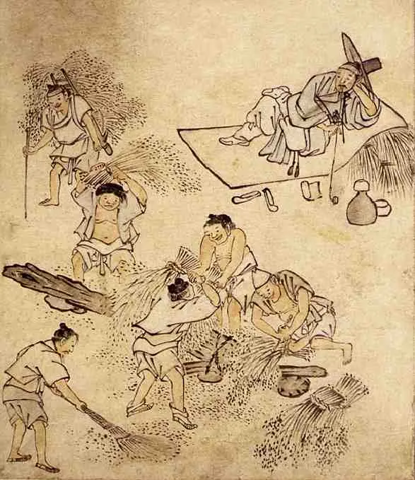 김홍도, 타작(打作), 단원풍속도첩(檀園風俗畵帖)에서 종이에 담채, 27cm x 22.7cm, 국립 중앙박물관 소장(이미지 출처: 위키미디어 커먼즈 https://commons.wikimedia.org/)