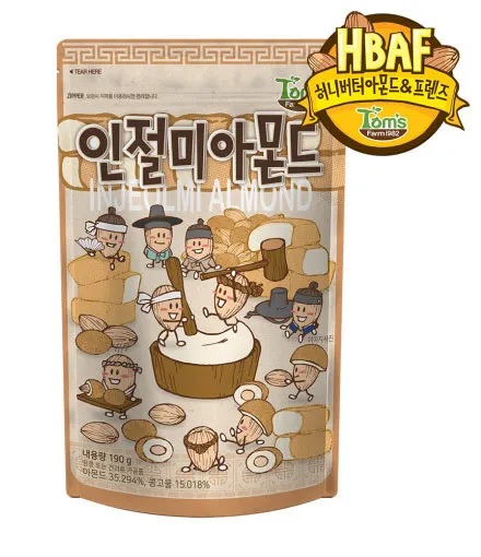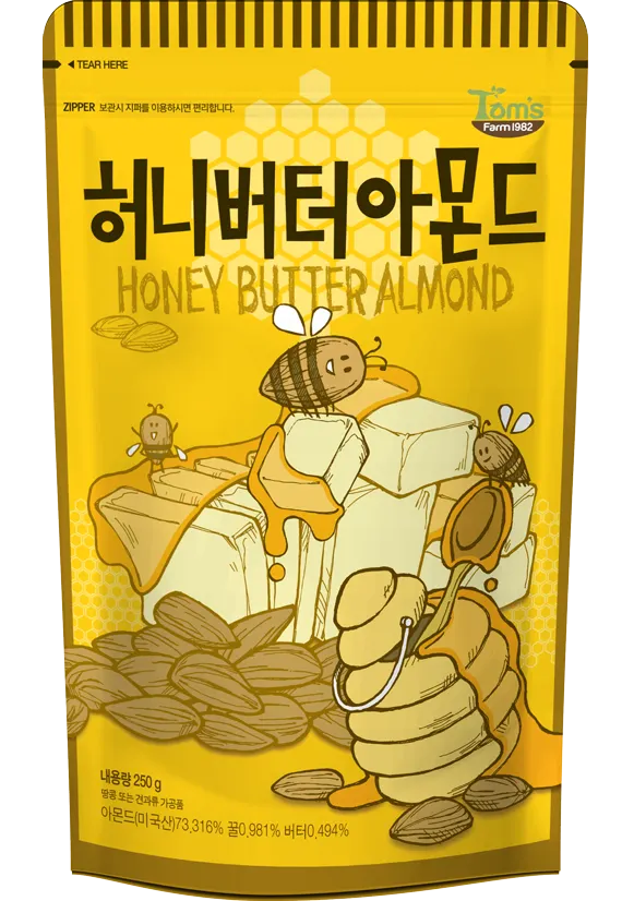 지하철 4호선 명동역에서 지상으로 올라와 거리로 들어서는 초입에는 ‘HBAF(허니버터 아몬드 앤 프렌즈, HONEY BUTTER ALMOND & FRIENDS)’ 플래그십 스토어가 있다. 플래그십 스토어 뿐만 아니라 관광객을 대상으로 하는 명동 골목의 각종 상점에서도 허니버터 아몬드 시리즈를 주력 상품으로 판매하는 모습을 심심찮게 볼 수 있는데, 형형색색의 아몬드 패키지로 가득 찬 길거리를 보고 있으면 이제는 양념 아몬드를 한국 특산품이라 쳐도 손색없겠다는 생각이 든다.