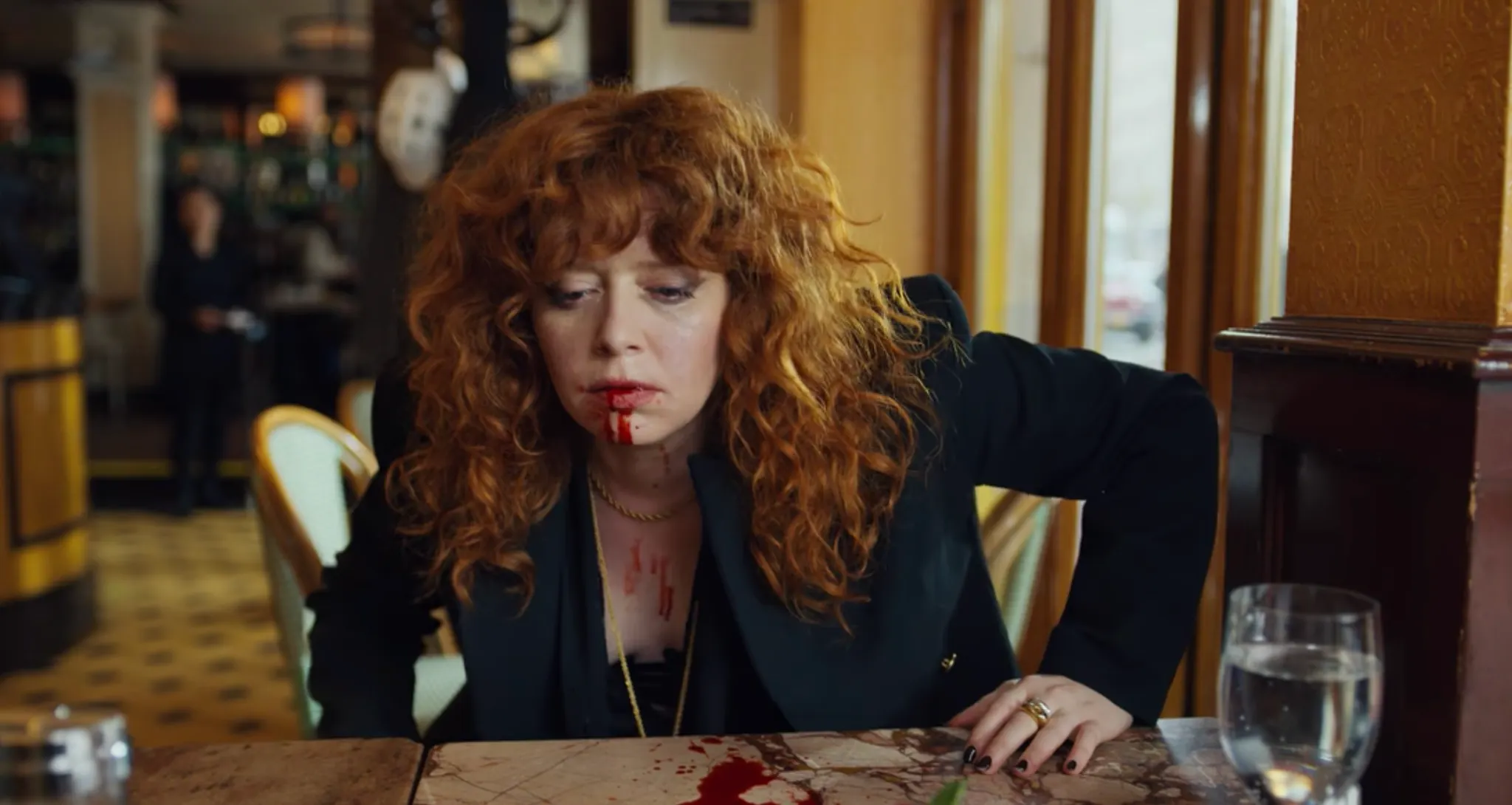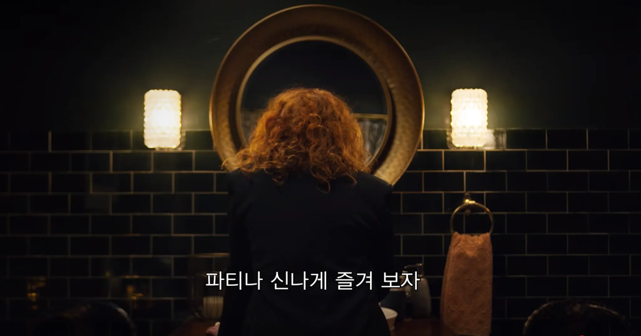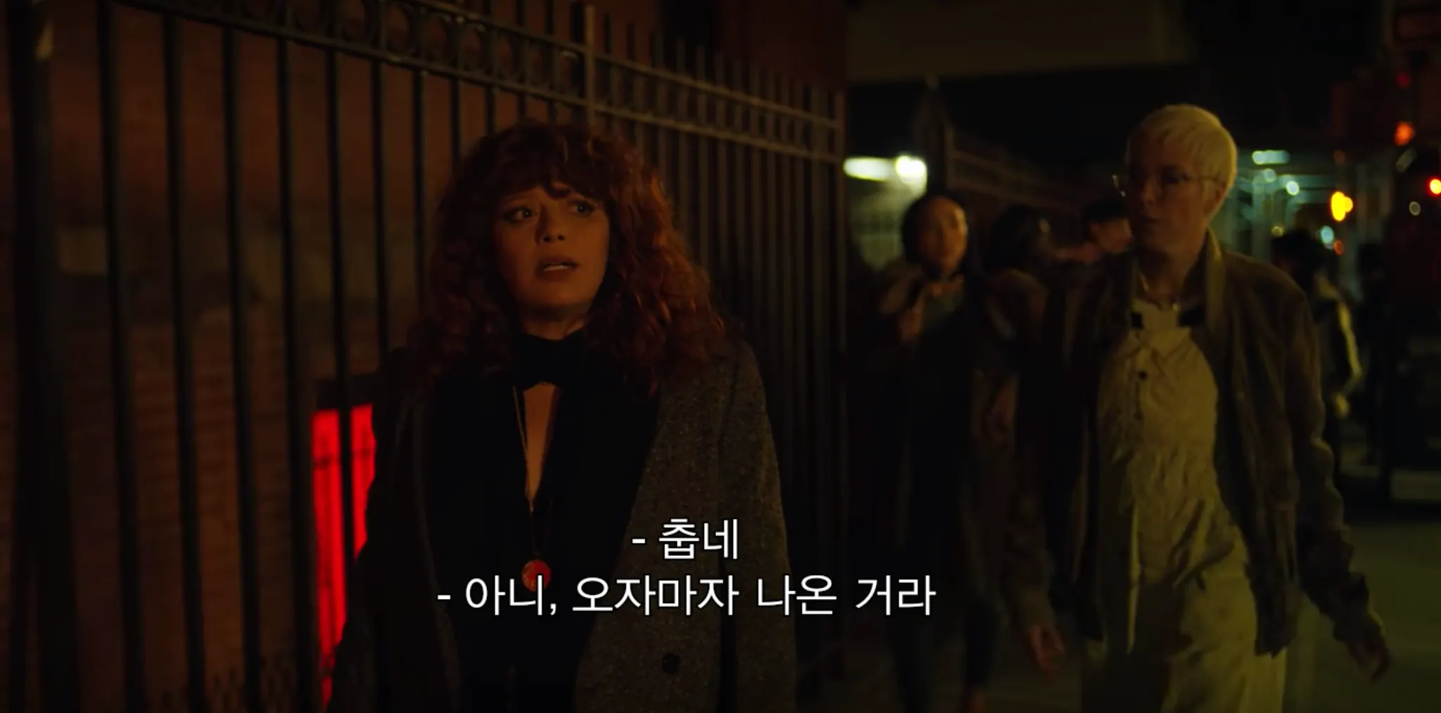 사실 ‘이 글을 써야겠다.’라고 다짐 하자마자 바로 선정한 로고타입이 ‘Russian Doll’이다. 넷플릭스 드라마 중에 이렇게 드라마의 색감과 잘 어울리는 로고타입이 또 있나 싶다. <러시아 인형처럼>은 검은색과 붉은색 두 가지의 상징적인 색감이 뚜렷하다. 우선 검은색은 공간적인 배경에서 자주 등장하는데, 매 화 반복적으로 등장하는 어두운 조명의 생일파티장 외에도 밤거리나, 어두운 복도에서 줄곧 검은 색감을 볼 수 있다. 또, 이 드라마에서 가장 중요한 소재인 ‘죽음'은 주인공이 흘리는 ‘피'의 색상인 붉은색으로 대변된다. 검고 붉은 색상이 주는 으스스하면서도 미스터리한 느낌이 타이포그래피와 너무나도 잘 어울린다.