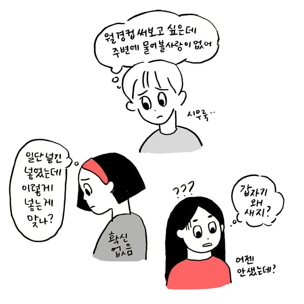 다행히 스튜디오를 하면서는 대상화나 배제를 당하는 경험이 현저히 줄었다. 활동가들이 많은 서울혁신파크에 입주해서 월경컵 정보 전달 프로젝트를 주로 했다 보니 자연스레 알고 지내는 사람이 여성, 페미니스트, 활동가들로 좁혀졌다. 말조심해야 하는 건 오히려 내 쪽일 경우가 많았고, 의뢰받는 일들의 주제도 인권, 페미니즘, 성평등 쪽이 많아져서 공부가 많이 되기도 했다. 당사자의 감각이 필요한 프로젝트를 함께하며 점점 일하는 여성으로서의 나의 미래를 꿈꿀 수 있게 되었다.