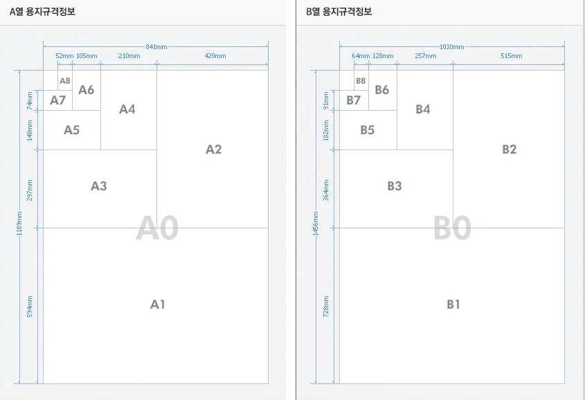 종이 종류에 따라 A 종이(국전)와 B 종이(4*6전지) 시리즈 사이즈가 나온다.