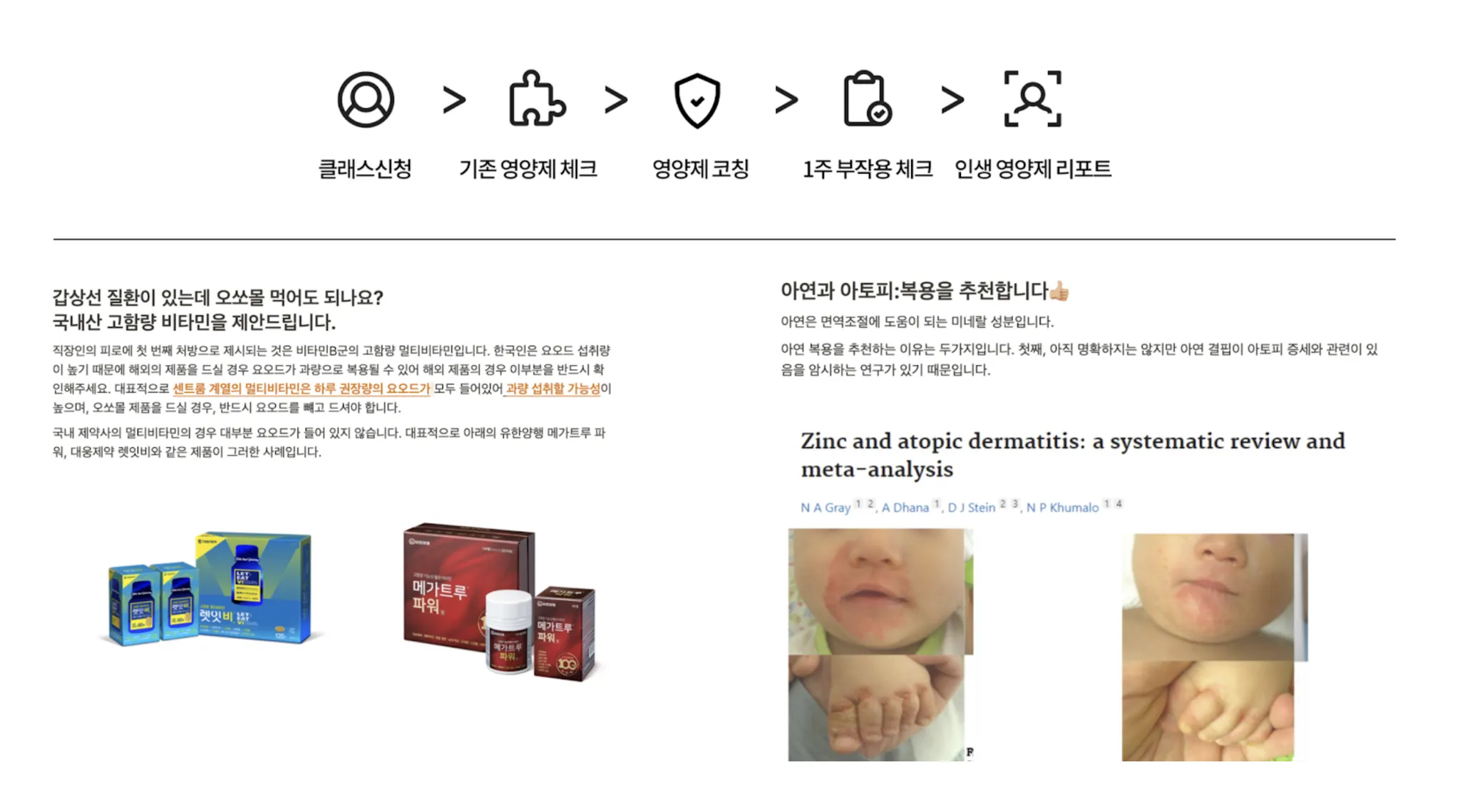 우리는 서비스 셧다운 기간동안 신규사업개발에 몰입했고, MVP(Minimum Viable Product)로 서비스를 만들어 200명을 대상으로 면역력 증진과 영양, 식단, 운동, 심리 코칭을 진행해보았다. IT 중심의 비대면 서비스로 모든 과정이 이뤄지다 보니 아이디어 단계의 타깃이었던 고령자보다 MZ세대에게서 훨씬 반응이 좋았다. 10개 이상의 영양제를 복용하며 겪는 부작용을 바로 잡아드렸다. 영양제 섭취는 이제 10가구 중 8가구가 구매 경험이 있어 보편적인 서비스가 되었다. 1명의 약사 상담으로 진행해본 MVP를 통해 효율화된 프로세스를 개발하고 있다. 추가로 MVP로 진행되었던 식단 코칭은 코로나로 폭식과 운동 부족으로 살이 찐 분들을 대상으로 진행했는데, 평균 2kg의 체중감량에 성공했다. 비만은 우울증부터 여러 합병증을 일으키는 주요 원인이기도 하므로 질환 관리 측면에서 중요한 역할을 하게 되었다.
