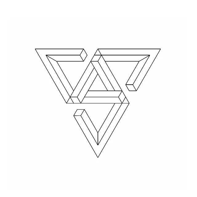 자세히 보면 모양이 같은 세 개의 도형이 입체적으로, 안과 밖이 모호하게 얽혀있는 형태다. 한 도형은 하나의 유닛이겠다. 그게 모여 작은 역삼각형들과 커다란 역삼각형을 만들어낸다.