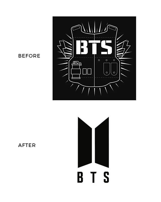 빅히트 엔터테인먼트의 남자 아이돌 그룹인 BTS의 한글명은 방탄소년단이다. 데뷔 당시 그들은 학교를 뛰쳐나가는, 자유분방한 소년들이 컨셉이었고 이 소년들이 자기를 무장하는 갑옷은 자작곡이었다. 활동을 진행하며 그들의 음악적 기조는 조금 더 크고 보편적인 방향이 되었다. ‘Love yourself’를 위시한 컨셉이 그것이다. 이 변화가 로고, 그리고 브랜딩에도 반영되었다. 아래는 BTS의 새 로고를 제작한 플러스엑스 신명섭 대표의 설명이다.