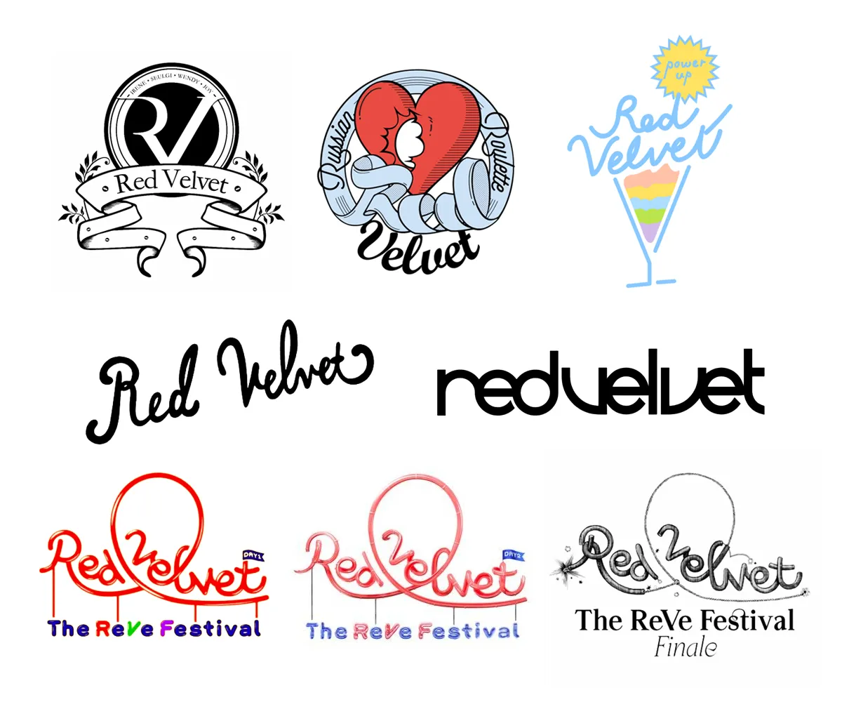 EXO와 같은 SM 엔터테인먼트의 여자 아이돌 그룹 레드벨벳 역시 앨범별로 로고가 변화하지만 기본 골격이 유지되지는 않는다. 그룹명인 Red Velvet만이 공통적으로 활용된다. 각 로고는 앨범 컨셉에 맞게 작업되었다.