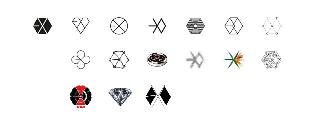 EXO는 최근의 앨범까지도 새로운 로고를 내놓고 있다. 그리고 이를 음원의 대표 이미지로도 활용한다. 로고가 이렇게 많지만 우리는 바로 유사성을 발견할 수 있다. 바로 맨 왼쪽 위에 놓인, 가장 처음의 엑소의 로고 속 E, X, O의 위치와 모양이 모든 로고에 들어가 있다.