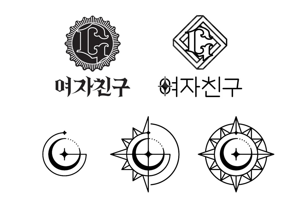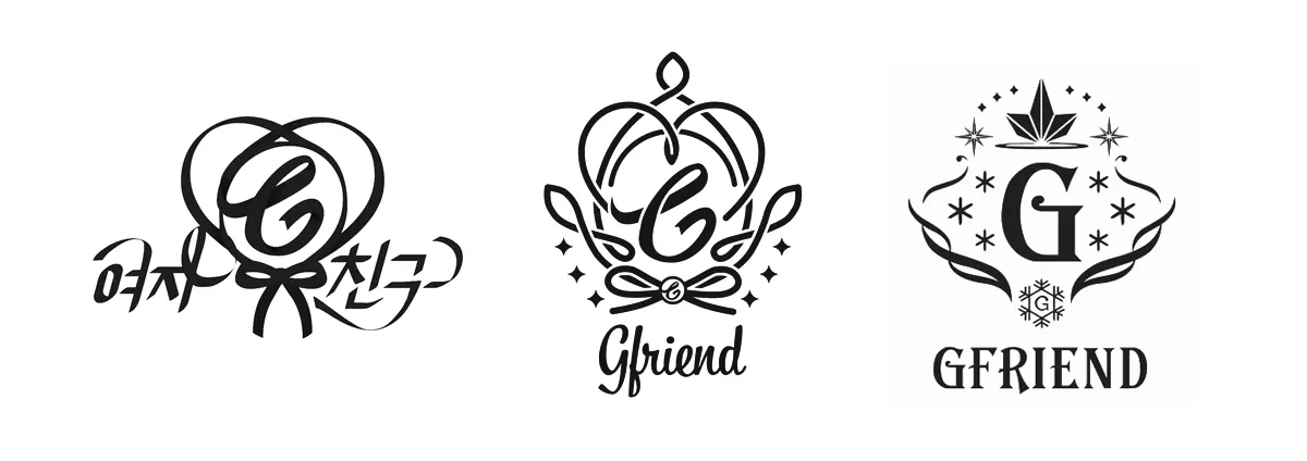 비슷한 형태로는 소스뮤직(현재는 빅히트 엔터테인먼트 내 레이블)의 여자친구가 있다. 이들 역시도 영문명인 GFRIEND에서 따온 G를 기본 구조로 두고 앨범 컨셉에 맞춰 로고를 변화시켰다. 여러 스튜디오와 디자이너가 로고를 작업했지만, 골격은 계속해서 유지된다.