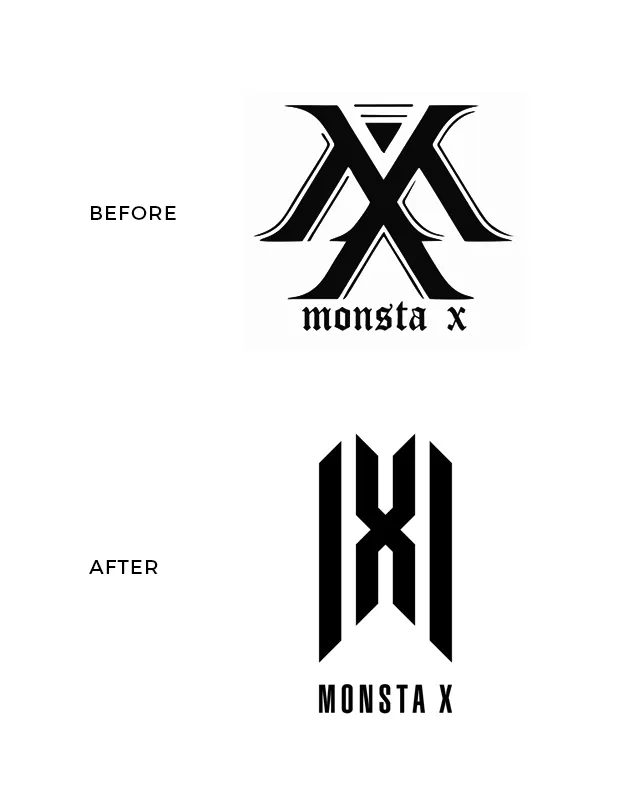 스타쉽 엔터테인먼트의 남자 아이돌 그룹 MONSTA X는 콘서트에서부터 로고를 변경해 가장 최근에 나온 앨범에까지 이를 반영했다. 고대 문양 같았던 로고와 아래의 타입이 현대적으로 바뀌었다. 그룹의 이름에서 비롯된 M과 X의 형태를 사용한 점은 동일하다. 새 로고 작업은 VB Studio에서 진행했다.